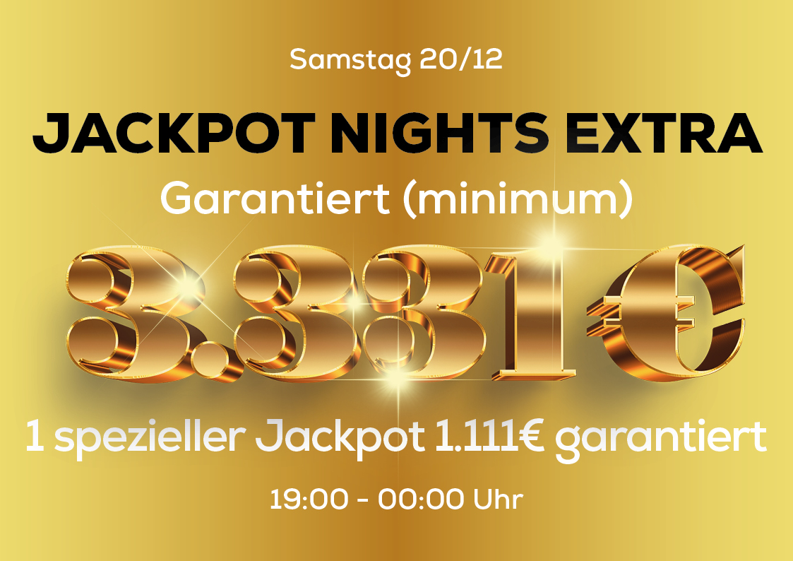 20. 12. – 🔥 JACKPOT NIGHT EXTRA – GARANTIERTER GEWINN (mindestens) 3.331 € + 1 SPEZIAL-JACKPOT 1.111 €.