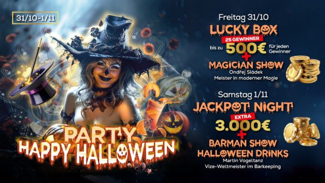Freuen Sie sich auf spezielle Spiele, Shows, thematische Dekorationen und ein abwechslungsreiches Programm, das Ihnen das Blut in den Adern gefrieren lässt. Merken Sie sich den 31.10. – 1.11.2025 vor und feiern Sie mit uns das Fest, an dem sich die Grenzen zwischen den Welten auflösen und das Glück den Mutigen gehört.