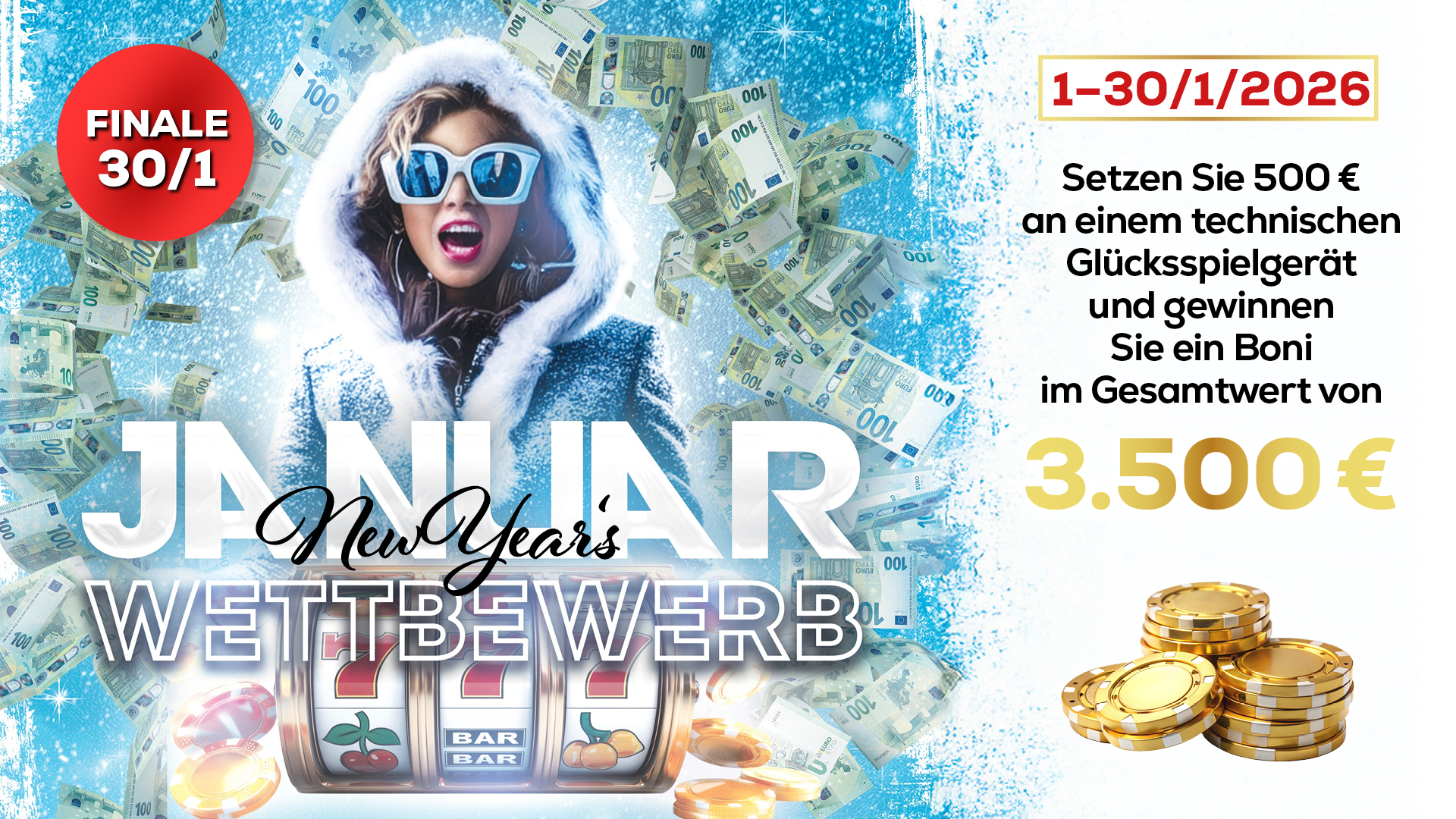 wir präsentieren Ihnen den NEW YEAR’S – JANUAR WETTBEWERB. Setzen Sie 500 € an einem technischen Glücksspielgerät und gewinnen Sie Boni im Gesamtwert von 3.500 €.