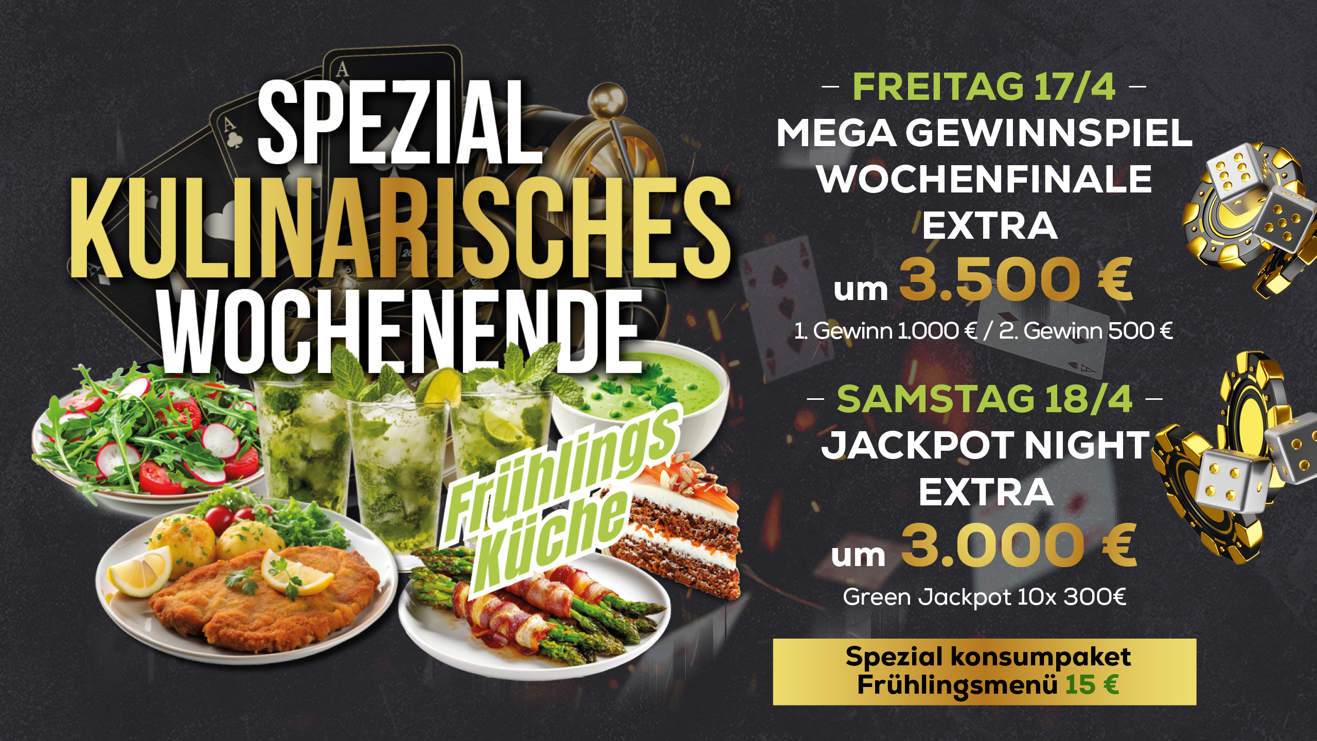 - Spezial Kulinarisches Wochenende Frühlingsküche, Großes Monatsfinale der MEGA GEWINNSPIEL, Wettbewerbe und Boni im Gesamtwert von 3.500 €, Jackpot Night EXTRA um 3.000 € (19–01 Uhr)