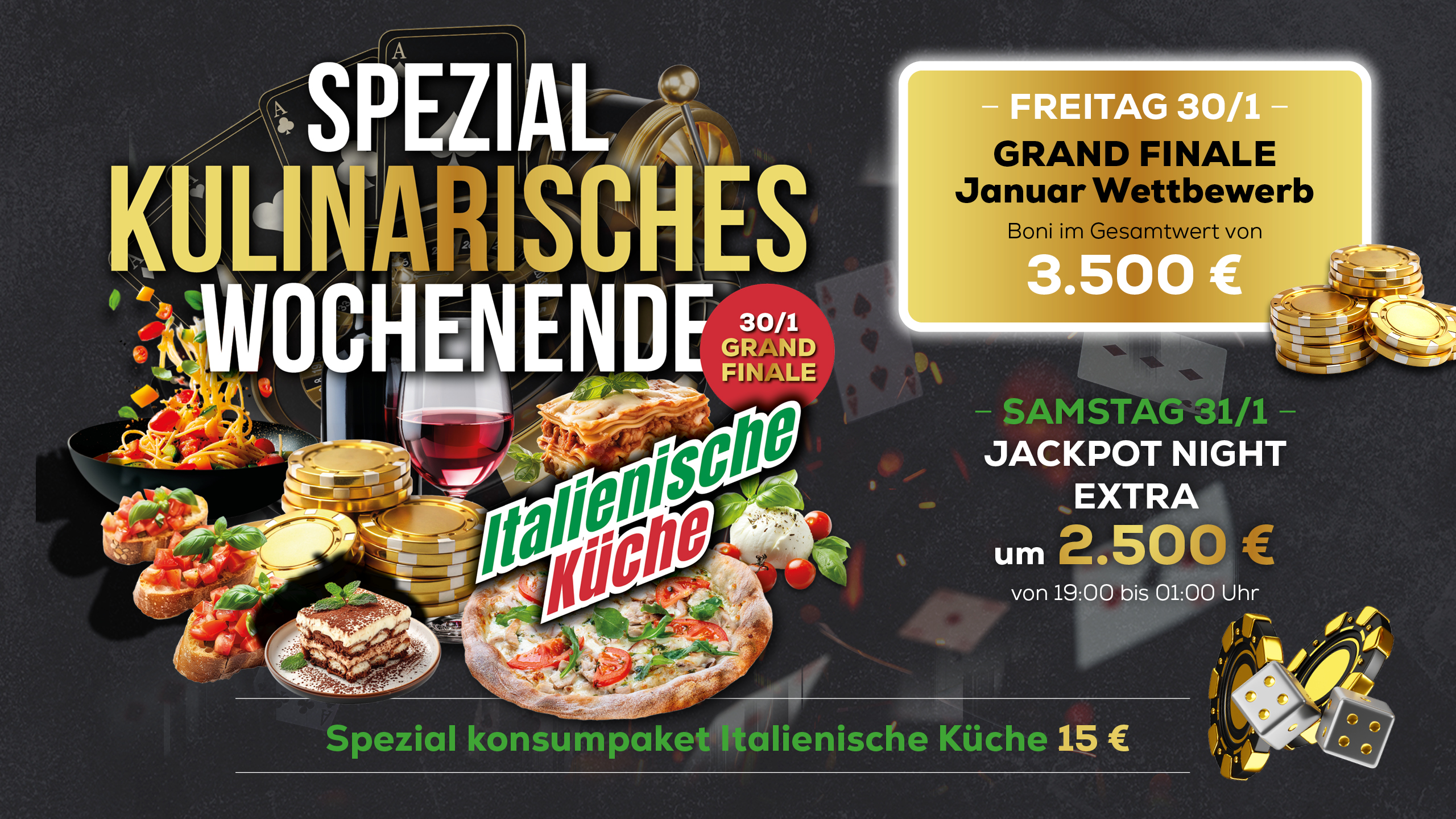 - Spezielles kulinarisches Wochenende der italienischen Küche, Großes Finale der Januar-Gewinnspiel mit Bonusaktionen im Gesamtwert von 3.500 €, Jackpot Night EXTRA – 2.000 € (19–01 Uhr)