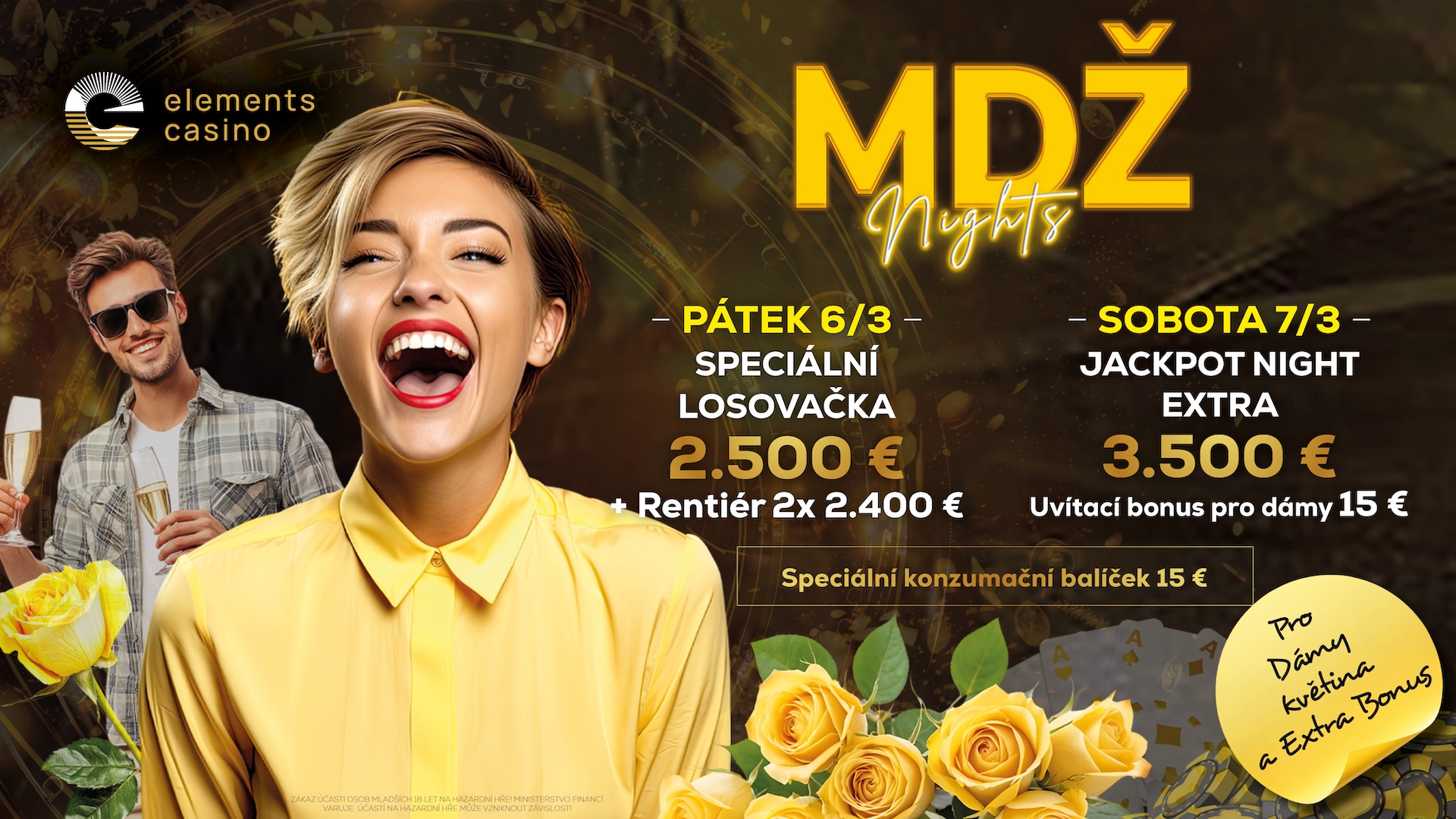 - MDŽ SPECIÁLNÍ LOSOVAČKA o 2.500 €, Celkové výhry večera až 7.300 €, Rentiér 2× 2.400 €, MDŽ JACKPOT NIGHT EXTRA o 3.500 €