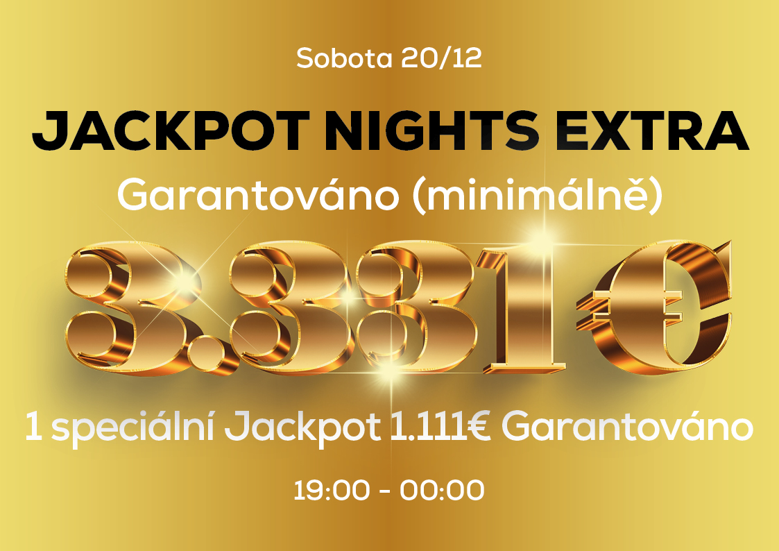 20. 12. – 🔥 JACKPOT NIGHT EXTRA – GARANTOVANÁ VÝHRA (minimálně) 3.331 € + 1 speciální jackpot 1.111 €.