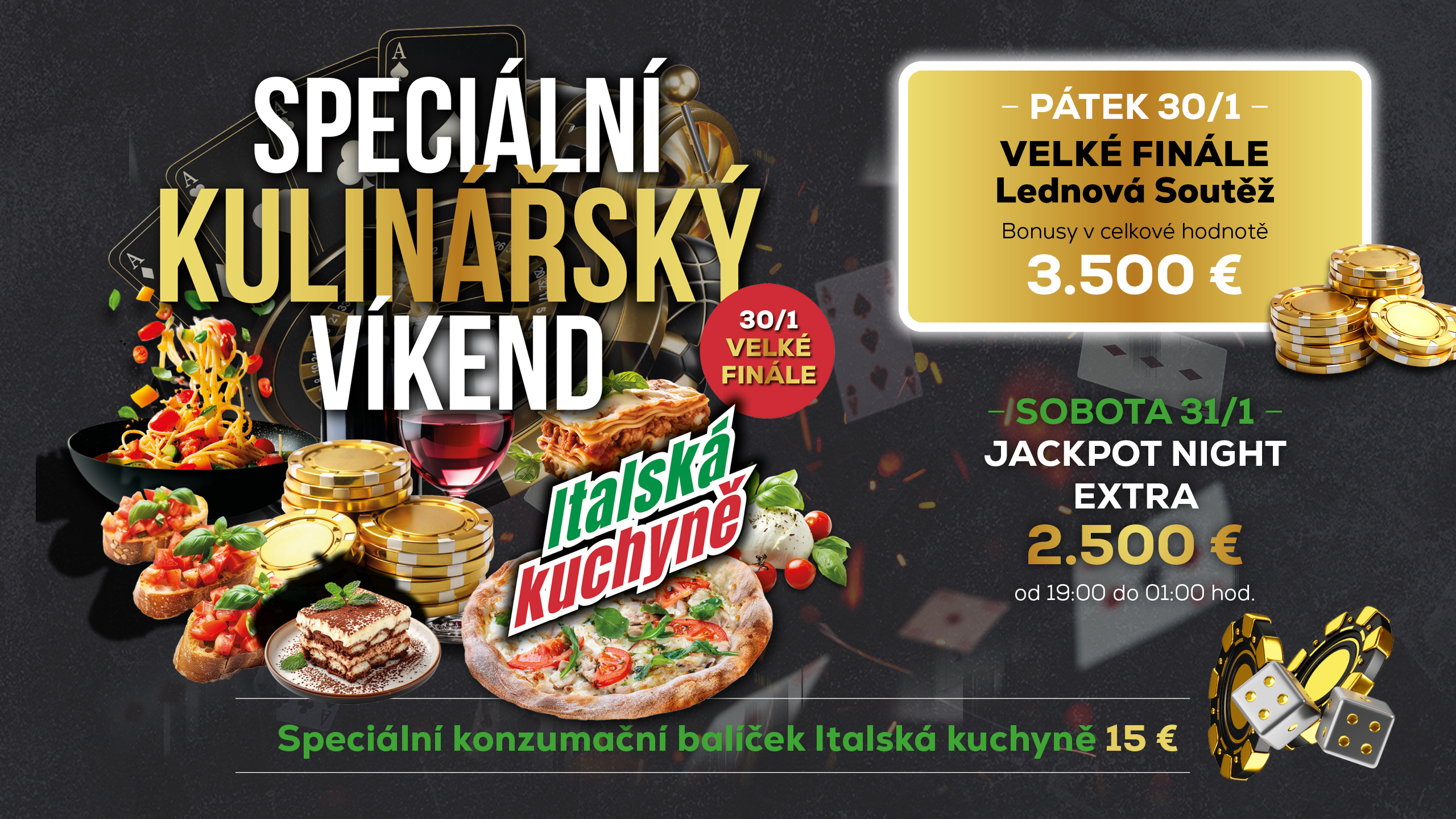 - SpeciálnĂ kulinářskĂ˝ vĂkend italskĂ© kuchynÄ›, VelkĂ© finále lednovĂ© soutěže bonusy v celkovĂ© hodnotÄ› 3.500 € , Jackpot Night EXTRA o 2.000 € (19-01 HOD.)