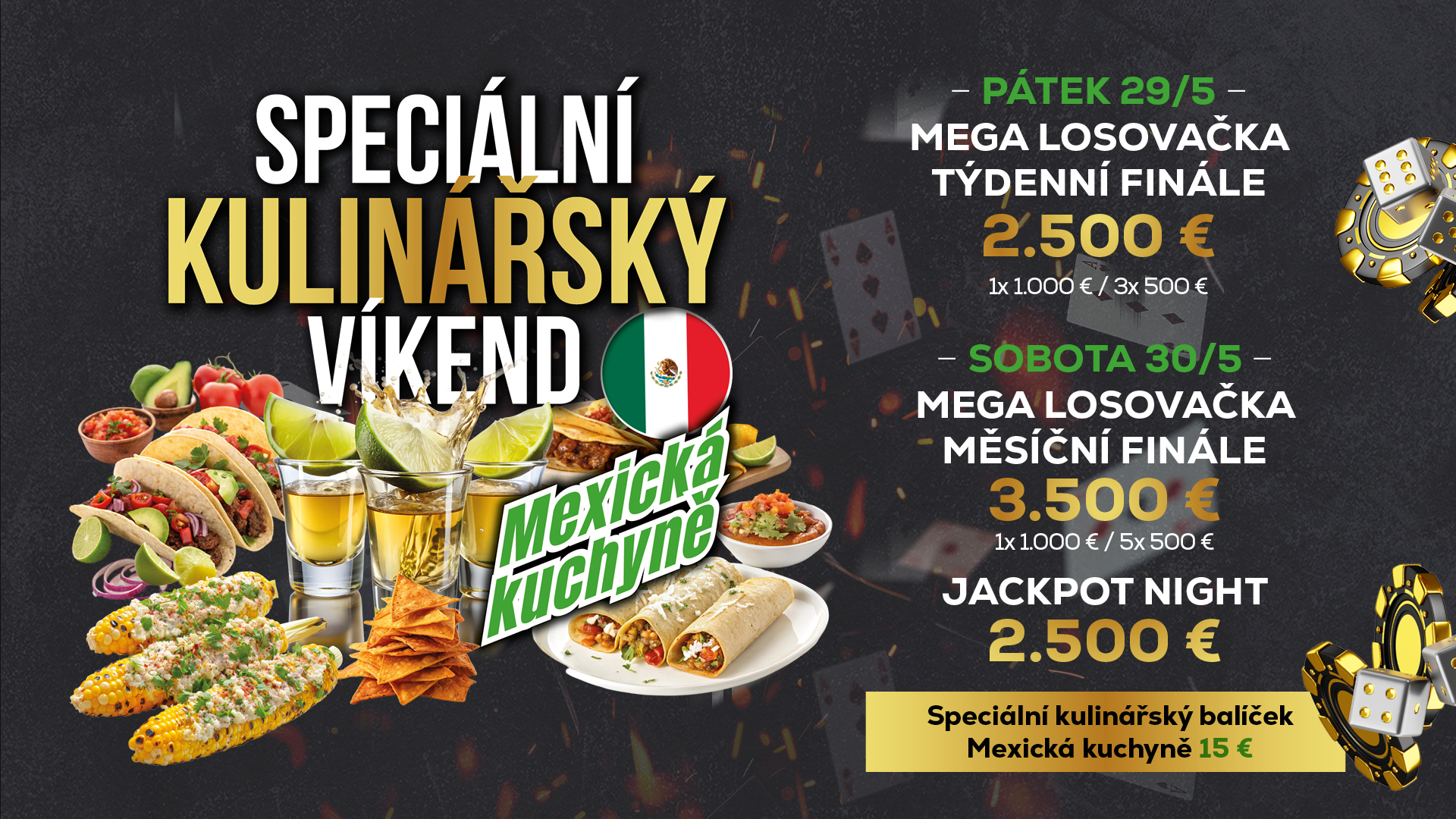 - Speciální kulinářský víkend mexické kuchyně, Velké měsíční finále MEGA losovačky, Saturday Jackpot Night o 2.500 € (19-01 HOD.)