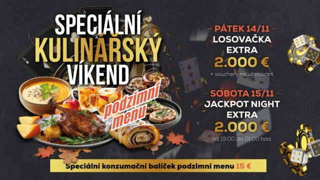 - SpeciálnĂ kulinářskĂ˝ vĂkend s podzimnĂm menu, LosovaÄŤka EXTRA o 2.000 € , Jackpot Night EXTRA o 2.000 € (19-01 HOD.)