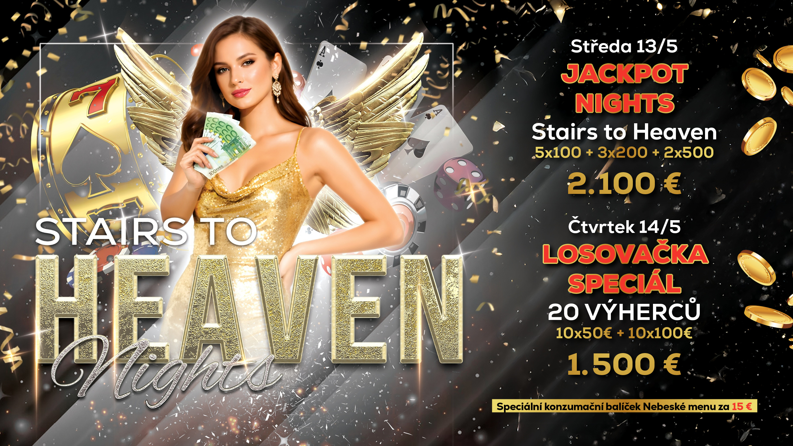 - Jackpot Nights Stairs to Heaven s výhrami 2.100 € (5×100 € + 3×200 € + 2×500 €) a Losovačka speciál pro 20 výherců o 1.500 € (10×50 € + 10×100 €)